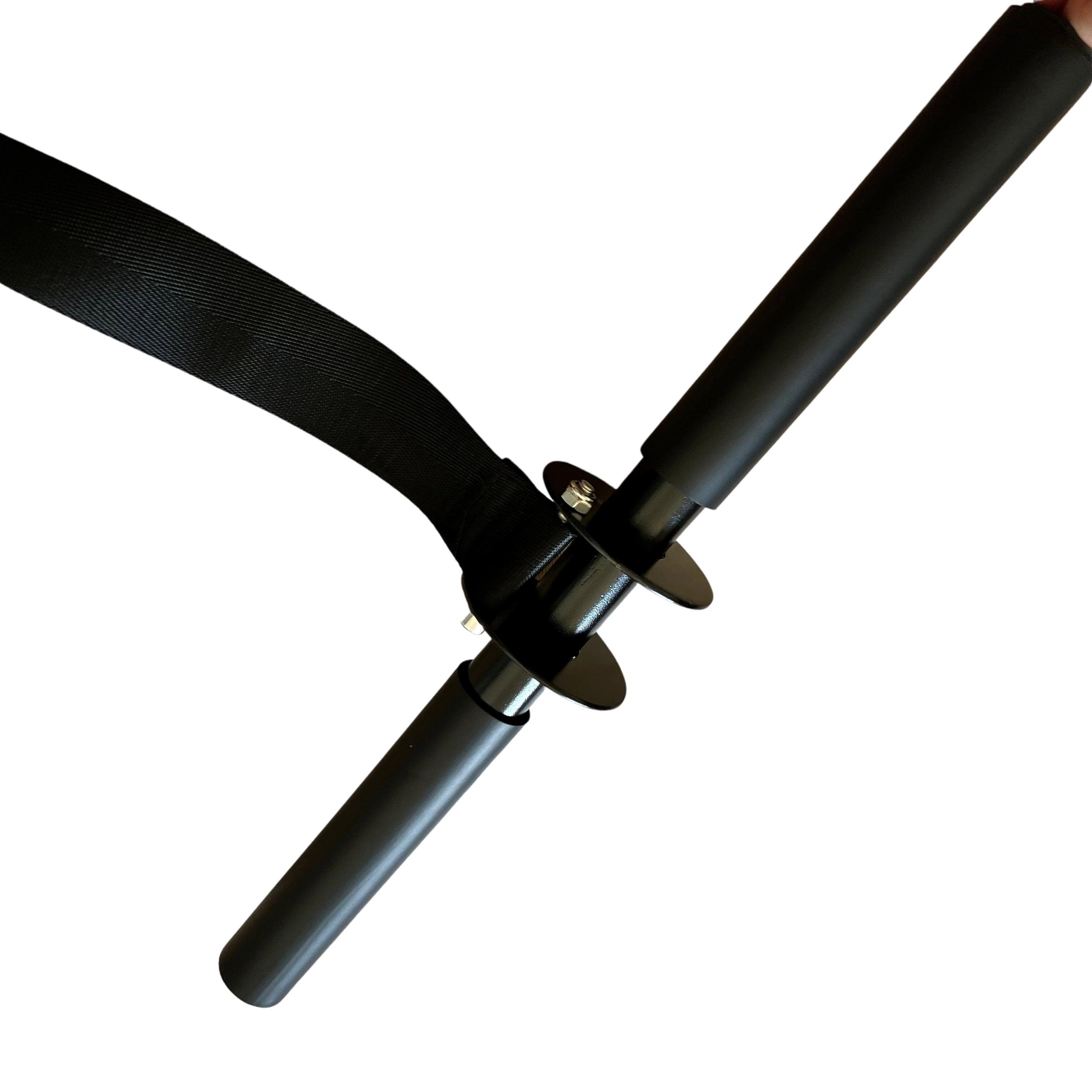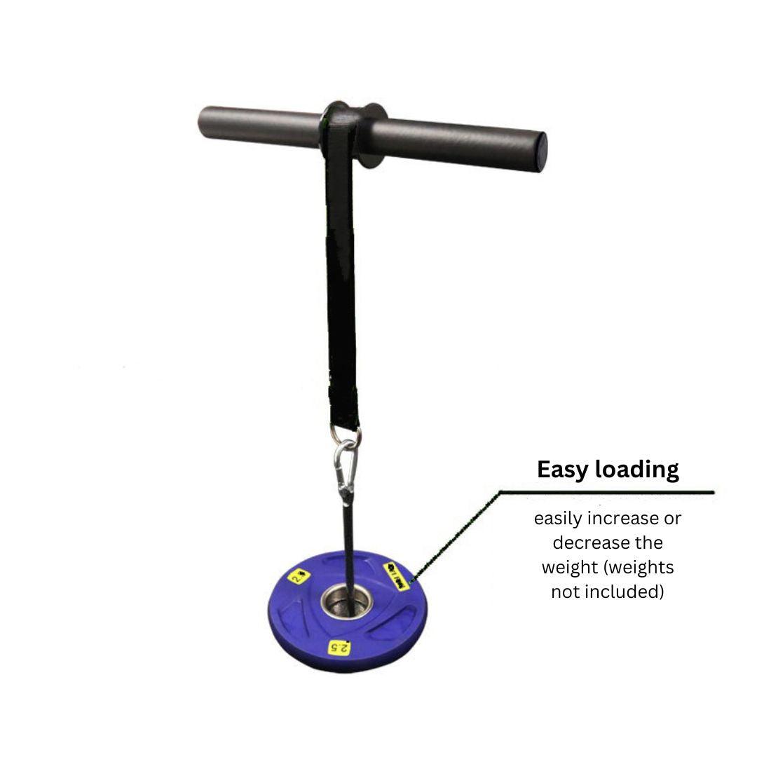 The weight hangs from a wide band that runs over an eccentric mount, varying the resistance during the exercise, further increasing the challenge. The band is 94cm long, and at the lowest point, you can continue rotating it, causing the band to roll in the opposite direction, applying a slightly different load to your forearms. The total width is 40cm, with two wide handles for a firm grip.