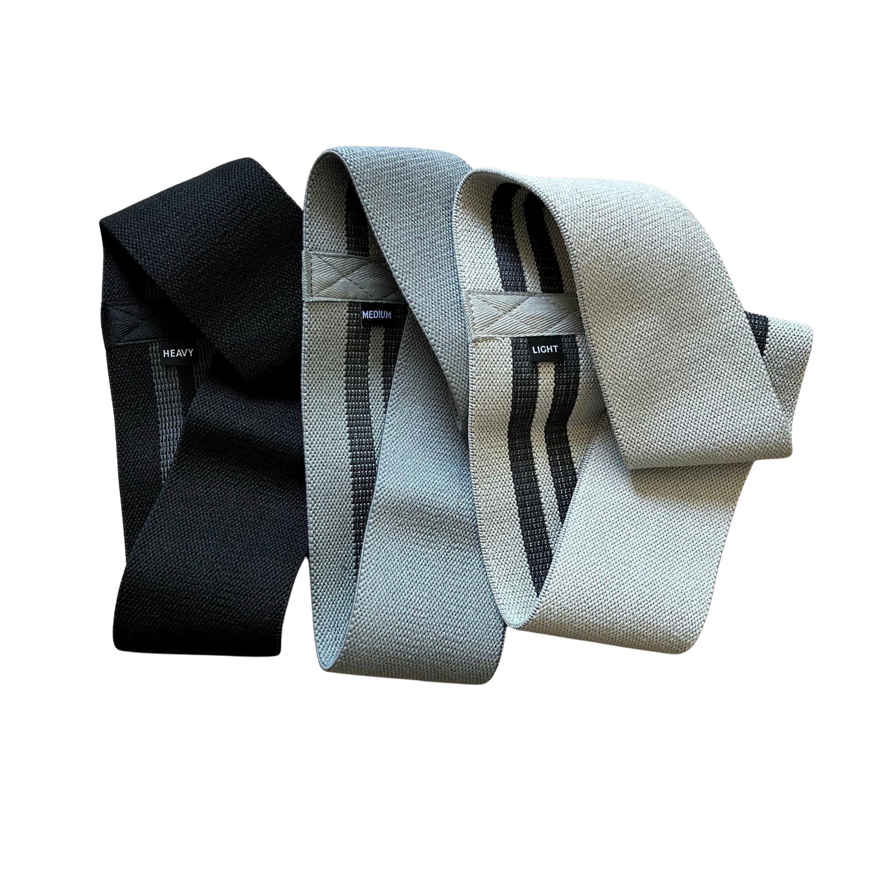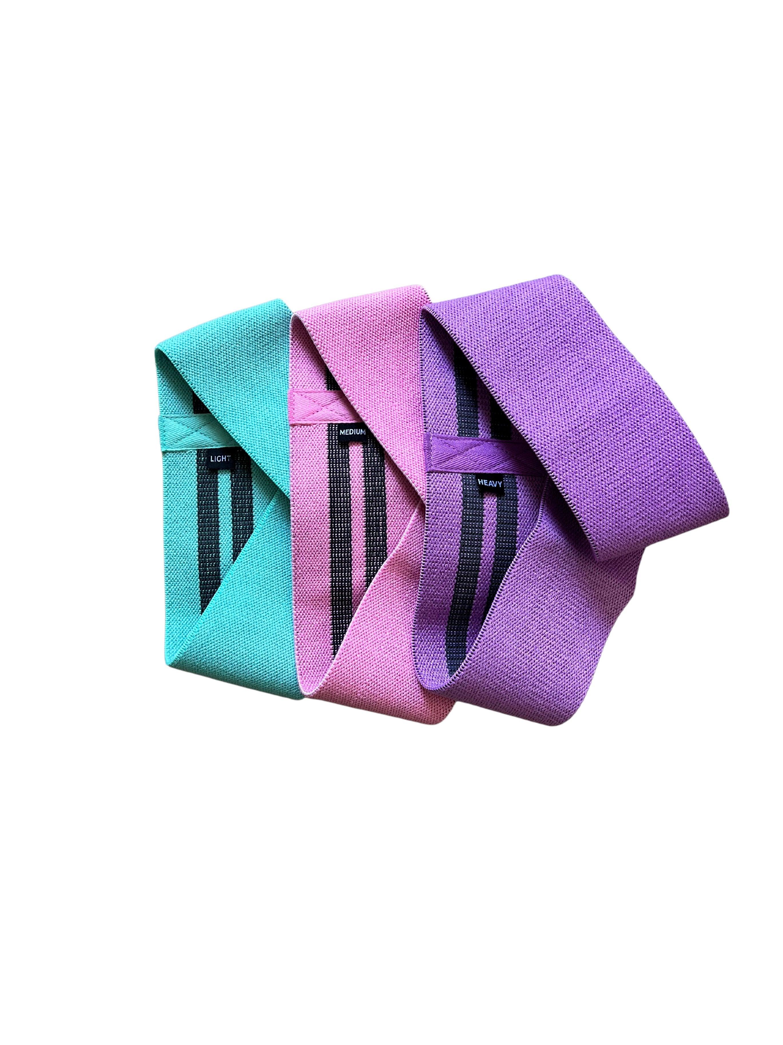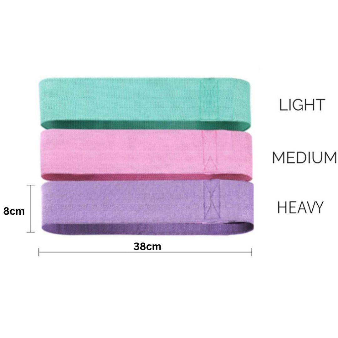 Set of 3 elastic bands, 38 cm long and 8 cm wide. Made of soft fabric with two anti-slip strips to keep the band in place during training.