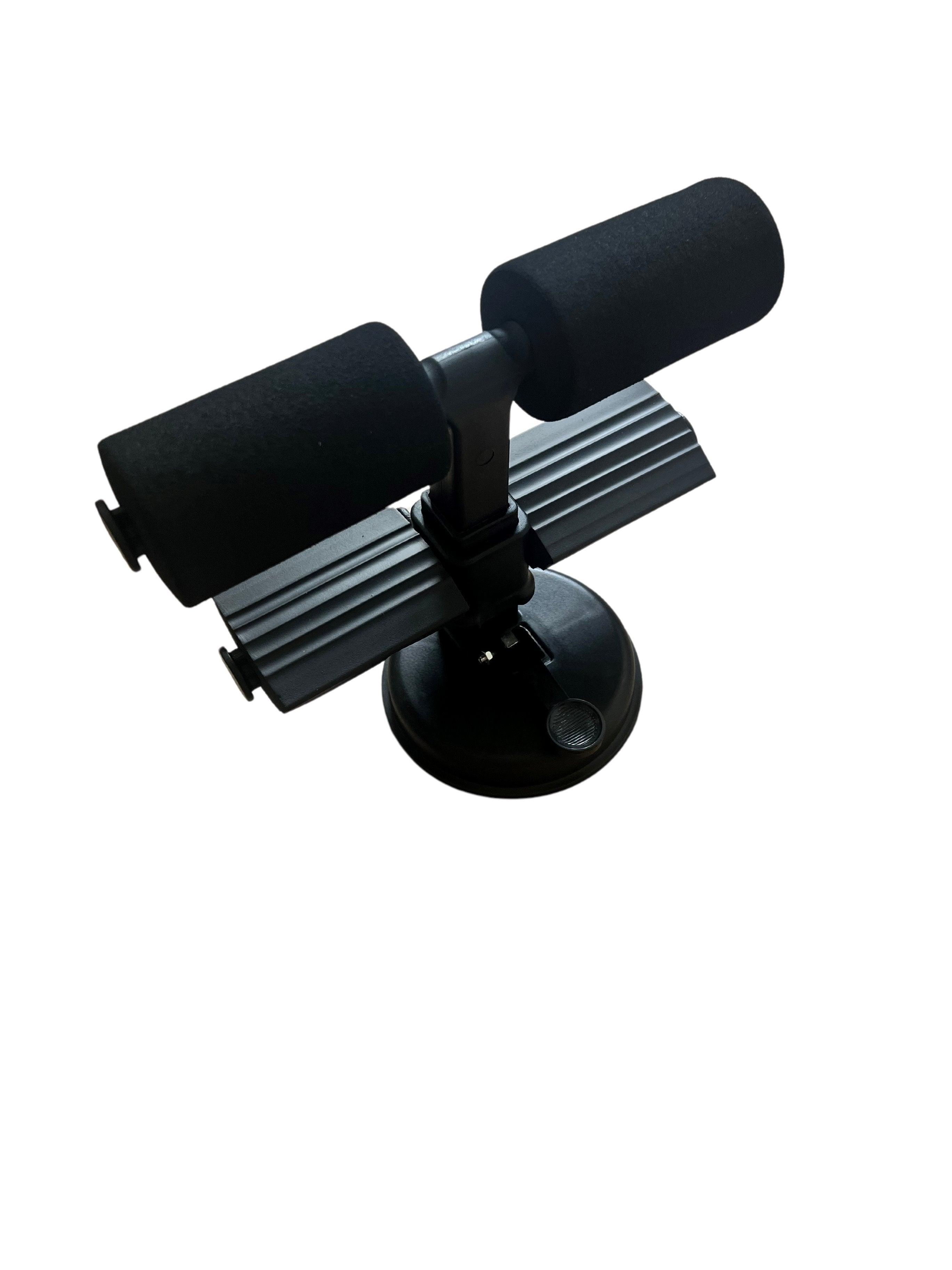 The sit-up assistant has a large suction cup that allows it to be securely attached to the floor. The system can be used with one or two horizontal foam rollers: the bottom one for feet to rest on and the top one for hooking. To make the exercise slightly more challenging, the bottom roller can be removed so that the feet have to rest on the floor for support.