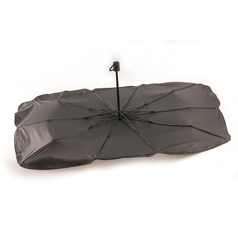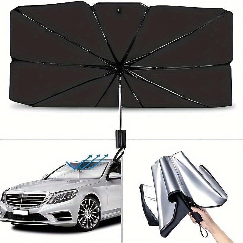 The sunshade unfolds like an umbrella and can be easily held in place by the sun visors and rearview mirror. After use, it folds back up like an umbrella and can be easily stored in a glove compartment, for example.